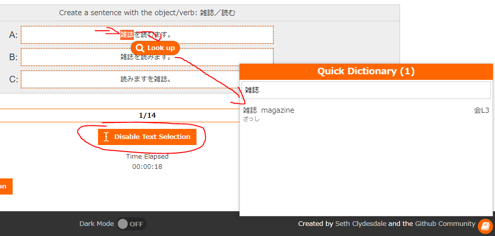 If you're trying to select text for a multiple choice answer, simply click the "Enable Text Selection" button. This will allow you to select and look up kanji/words in answers.
